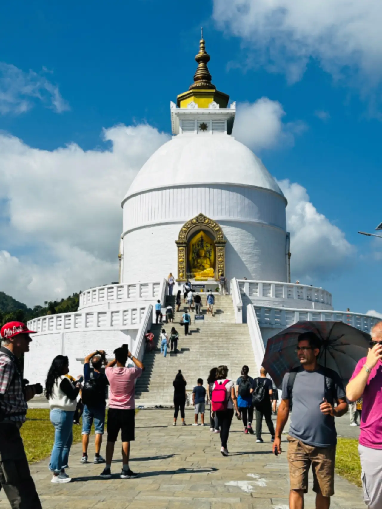High above the lake stands the World Peace Pagoda, also known as the Shanti Stupa. This beautiful white dome symbolizes non-violence, peace, and harmony. It was built under the guidance of Japanese monk Nichidatsu Fujii, founder of Nipponzan Myōhōji, who visited Nepal in the early 1970s and shared his vision of peace with King Birendra.